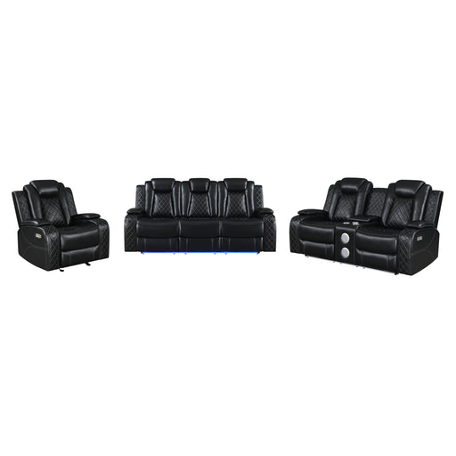 Orion Collection by New Classic Furniture Black finish Leather upholstered frame Reclining mechanism Storage arms Drop down center sofa back dring...