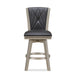 The Berkely Counter Stool adds a bit of modern glam to your kitchen or entertainment space with its flared, button tufted back and platinum finish. The 24" seat is capped with a cushion crowned in a black PU, fully welted for an upscale look. The stool has a 360-degree swivel, making it easy to converse and enjoy the party. Crafted of solid wood for strength and durability. Also available in 30" bar height.