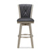 The Berkely Counter Stool adds a bit of modern glam to your kitchen or entertainment space with its flared, button tufted back and platinum finish. The 30" seat is capped with a cushion crowned in a black PU, fully welted for an upscale look. The stool has a 360-degree swivel, making it easy to converse and enjoy the party. Crafted of solid wood for strength and durability. Also available in 24" bar height.